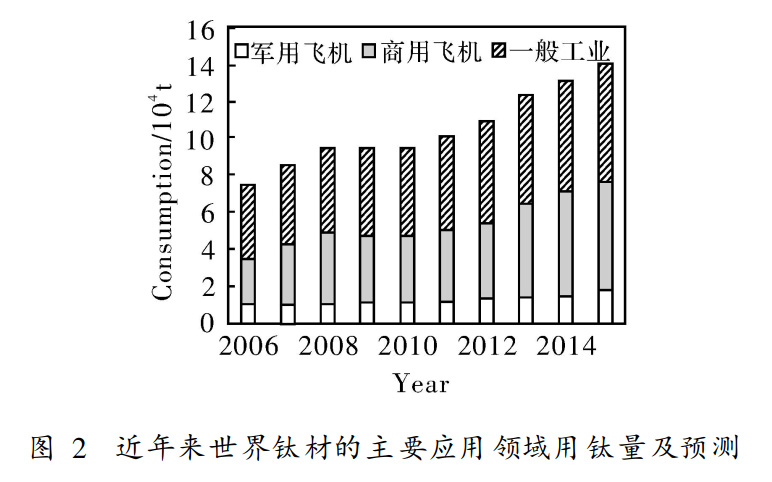 空客公司的A320飛機自1985年到2005年生產量達到4500架。每架空客A320用鈦量為13t。波音公司的B737飛機生產量自1968年到2005年達到6500架,每架波音B737用鈦量為18t。未來一代的空客A320波音B737窄體型飛機將采用先進技術制造,意味著飛機機身有更多的部件使用鈦材,其中用鈦量較大的是起落架和發動機吊艙,預計每年鈦材額外用量將達到1500~6000.圖1示出世界主要商用飛機單機的用鈦量。圖2示出近年來世界鈦材在軍用飛機、民用飛機及一般工業領域的用鈦量及預測。