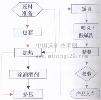 鈦是一種高活性金屬,不僅在空氣中加熱極易污染,而且在一定的溫度、壓力和表面狀態下具有和模具粘結的特性。鈦的導熱性差,熱擠壓時坯料表層與中心易產生較大溫差,促使金屬流動不均勻性加劇,這樣表面層就產生較大的附加拉應力,在制品表面易形成裂紋。嚴重時,在擠壓棒材及管材上可能產生大的中心擠壓縮孔。同時,擠壓鈦及鈦合金時熱效應顯著,不合適的擠壓工藝對擠壓品組織和性能有副作用。鈦的彈性模量低,回彈嚴重,成型困難。因此鈦合金擠壓變形過程比鋁合金、銅合金等其它有色金屬擠壓變形過程更為復雜。鈦材熱擠壓工藝過程根據坯料是否包套有所區別,其主要工藝流程如圖2所示。鈦材熱擠壓技術發展至今,中外相關技術人員圍繞提高鈦擠壓材質量和成材率、降低生產成本在坯料制備、坯料加熱溫度、擠壓比、擠壓速度、潤滑及擠壓模具等方面做了大量研究探索工作。