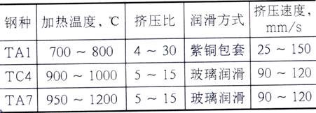 需要指出的是,鈦及鈦合金優質產品的擠壓,要求在保持工具有滿意壽命的條件下制定正確的生產工藝,即要求溫度、擠壓速度、擠壓比及潤滑方式的配合。上表列舉了典型鋼種擠壓棒材的參數。