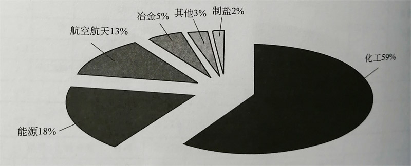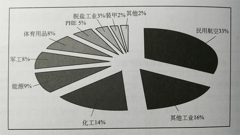 鈦合金的應(yīng)用領(lǐng)域廣泛。圖1-2顯示了20世紀北美、西歐鈦在各領(lǐng)域的使用量,其中民用航空領(lǐng)域鈦的使用量 最大,占33%,其次為化工、能源、軍工和體育用品,少量的部分用于PHE、脫鹽工業(yè)和裝甲等。