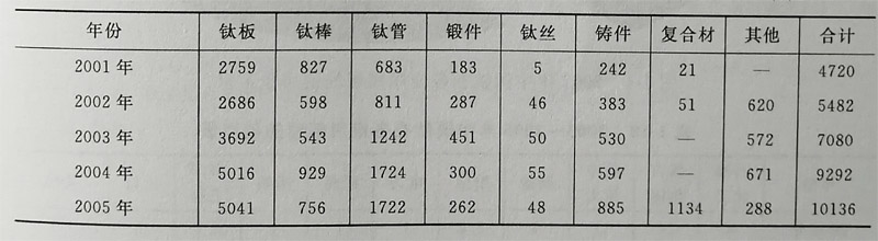 美國與日本的鈦加工材用途比較見表1-16,數(shù)據(jù)來源于上海國際鈦會議(從表1-16中可看出美國2001年鈦加工 材用量為24979t,其中宇航用量為14500t,占58.5%,這說明美國以航空工業(yè)為主。日本2002年鈦加工材用量為 14481t,其中宇航用量為705t,只占4.9%,日本是以民用工業(yè)為主。俄羅斯2000年宇航應(yīng)用為45%~48%,船舶應(yīng) 用為7%~12%,石油、化工和其他工業(yè)應(yīng)用為12%~18%,出口為20%~30%,說明俄羅斯以宇航和船舶工業(yè)為主 出口量也較大近5年來,中國鈦材產(chǎn)量見表117(根據(jù)中國鈦協(xié)會統(tǒng)計),2001年為4720:;2002年為5482t;200年 為7080t;2004年為9292t;2005年為10136t鈦材產(chǎn)量增加近一倍(近10000,日前已成為繼美國、俄羅斯、日本 之后,躋 身世界第四大鈦工業(yè)國。