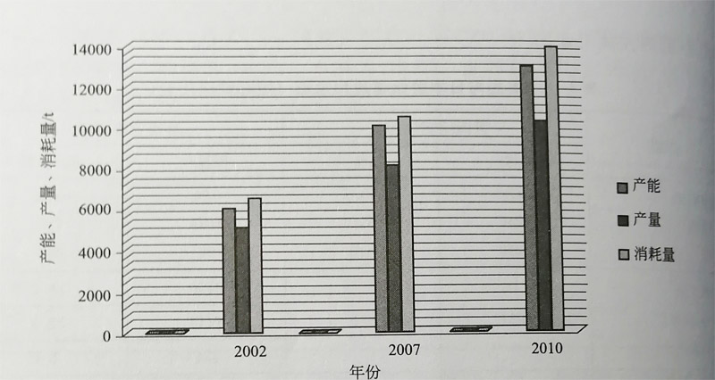 中國鈦工業(yè)協(xié)會統(tǒng)計了2002年和2007年中國鈦的產(chǎn)能、產(chǎn)量和消耗量,如圖1-3所示。2007年的產(chǎn)能、產(chǎn)量和 消耗量分別為100018000、10500t,而2002年的產(chǎn)能、產(chǎn)量和消耗量分別為6000、5000t、6500t,年增長率約 為9%按此增長率計算2010年中國鈦的產(chǎn)能、產(chǎn)量和消耗量分別為130001、100014000,將居世界第三位 。