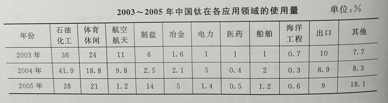 2003~2005年中國鈦在各應(yīng)用領(lǐng)城的使用量