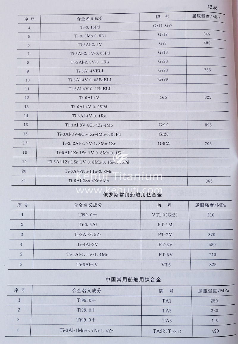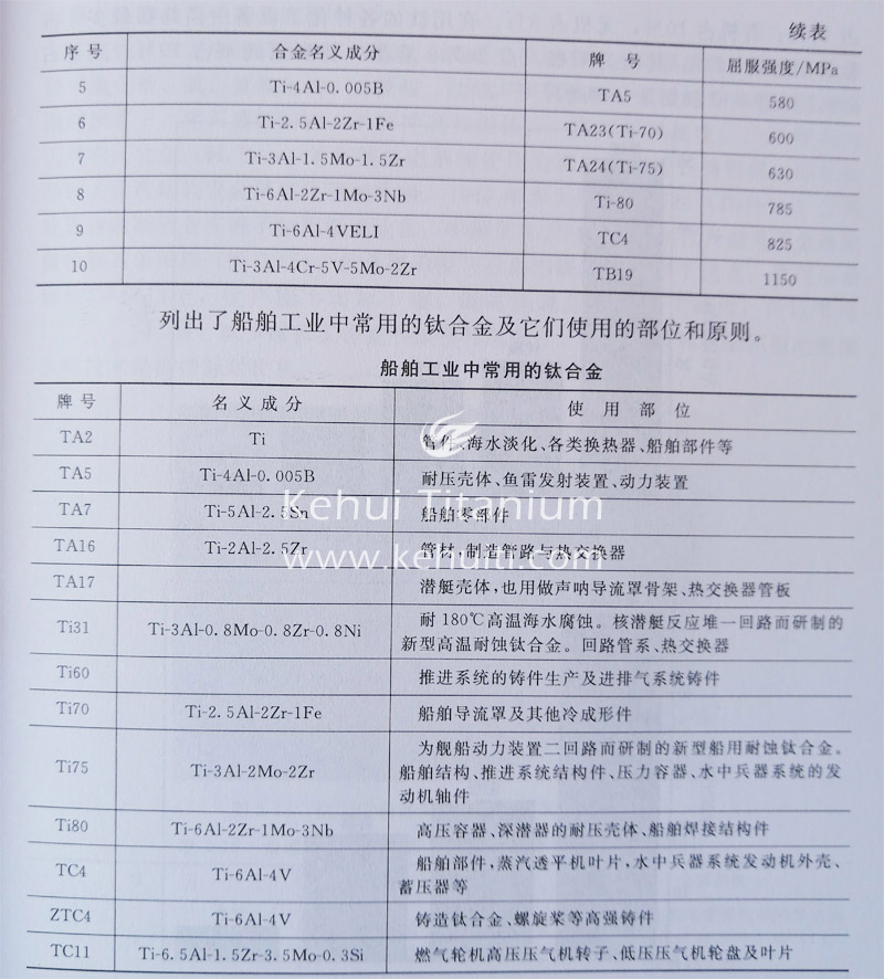以下列出船舶工業中常用的鈦合金及它們使用的部位和原則