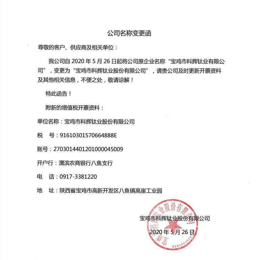 我公司自2020年5月26日起將公司原企業名稱“寶雞市科輝鈦業有限公司”,變更為“寶雞市科輝鈦業股份有限公司”,請貴公司及時更新開票資料及其他相關信息,不便之處,敬請諒解!