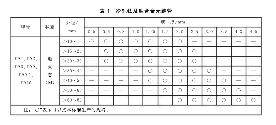 3.1.1.1 冷軋鈦及鈦合金無縫管的牌號、狀態(tài)和規(guī)格應(yīng)符合表1的規(guī)定。