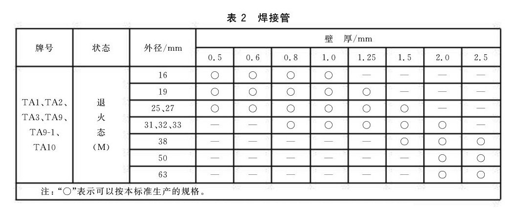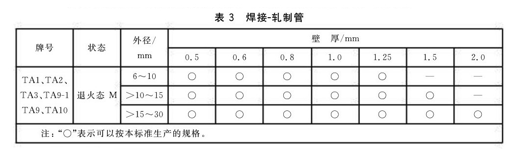 3.1.1.3 焊接-軋制法生產(chǎn)的鈦及鈦合金管的牌號、狀態(tài)和規(guī)格應(yīng)符合表3的規(guī)定。