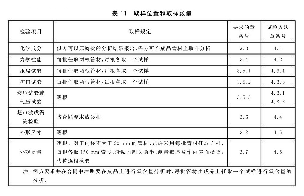 5.5.2 室溫力學(xué)性能檢驗(yàn)、壓扁試驗(yàn),擴(kuò)口試驗(yàn)中,如有一個(gè)試樣檢驗(yàn)結(jié)果不合格時(shí),則從該批取雙倍試樣對不合格項(xiàng)目進(jìn)行重復(fù)試驗(yàn),如重復(fù)試驗(yàn)結(jié)果仍有一個(gè)試樣不合格時(shí),則該批產(chǎn)品不合格,但允許供方逐根對不合格項(xiàng)目進(jìn)行檢驗(yàn),合格者重新組批。