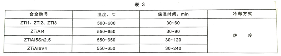 2.8.2 對形狀復(fù)雜,或使用條件苛刻的重要鑄件,需方要求并在合同中注明時(shí),應(yīng)在真空中進(jìn)行消除應(yīng)力退火處理。常用鑄造鈦及鈦合金消除應(yīng)力退火處理制度可參照表3。其他合金的熱處理制度由雙方協(xié)商確定。