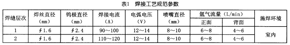 1.1.4 根據離子膜工程鈦管的規格尺寸及有關資料介紹的參考工藝值,選擇了適當的管徑及壁厚(φ89×3)制訂出供鈦管焊接工藝規范參數,詳見表1。