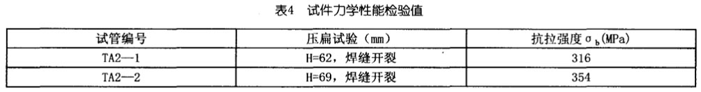 TA2一1試件壓扁試驗,壓板間距(H)34mm合格,實測壓扁值為62mm時焊縫部位開始出現裂紋。TA2一2試件壓扁試驗,實測壓扁值為69mm時焊縫部位開始出現裂紋。TA2一1、TA2一2試件的抗拉強度值都低于TA鈦材標準值440~620MPa(GB/T3624)。力學性能檢驗結果見表4。