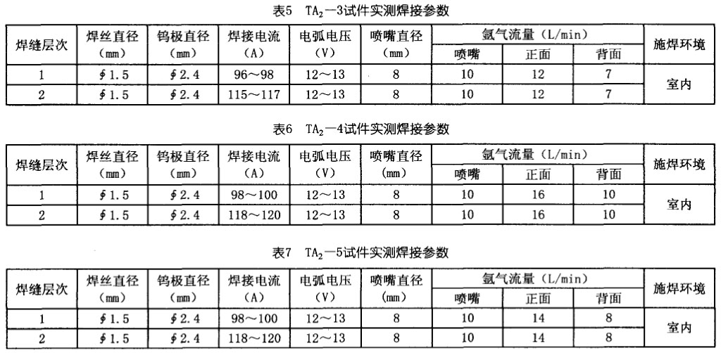TA2—3、TA2—4、TA2—5試件的實測焊接參數見表5、表6、表7。