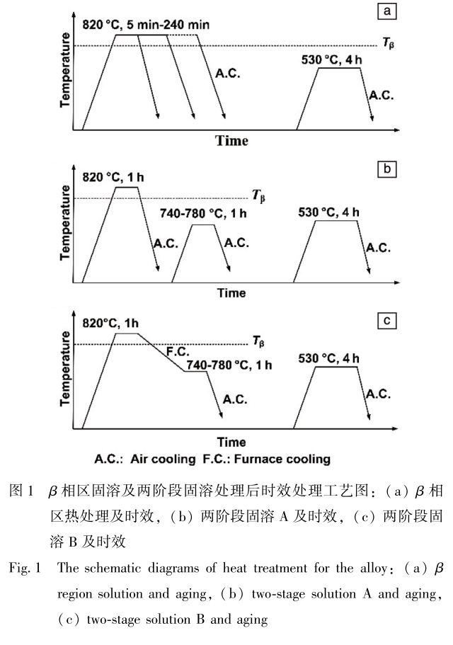 實驗用鈦合金選用作者研究組自主研發的一種新型Ti-Al-Mo-V-Cr-X合金,合金相變點約為800℃。經過3次真空自耗熔煉獲得鑄錠,β相區開坯后進行(α+β)相區及β相區鍛造獲得直徑為400mm的大規格鈦合金棒材。 為了避免大規格棒材組織的均勻性不足,影響實驗結果,試樣只截取鍛造棒材心部材料。多種熱處理工藝設計如圖1所示。對合金試樣進行β相區固溶處理,保溫5~240min后空冷,再統一于530℃時效4h,如圖1a所示。對合金進行兩階段固溶,兩階段固溶方式A:先在高于相變點溫度(820℃)下固溶1h后空冷至室溫,再經(α+β)相區不同溫度(740,760和780℃)分別保溫1h后空冷至室溫(分別計為820+740、820+760和820+780),最后進行530℃/4h時效處理,如圖1b所示。兩階段固溶方式B:在820℃固溶1h后緩慢爐冷至(α+β)相區不同溫度(740,760和780℃),分別保溫1h后空冷至室溫(分別計為820~740、820~760和820~780),最后進行530℃/4h時效處理,如圖1c所示。
