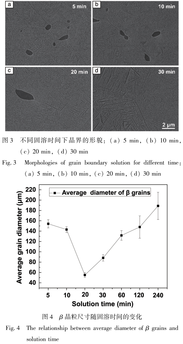 β相區處理形成等軸β晶粒,β晶粒尺寸及晶界強度是影響超高強鈦合金強韌性的主要因素,通過調控熱處理工藝參數實現對鈦合金顯微組織的控制,是一種經濟且有效的強韌化手段[13,14]。本文通過調控高強鈦合金熱處理制度獲得具有不同β晶粒尺寸及不同晶界形貌的組織,研究了β相區固溶時間對β晶粒尺寸及高強鈦合金力學性能的影響,探究了兩階段固溶過程中晶界的粗化行為對合金力學性能的影響,為高強鈦合金的工業生產提供理論參考。