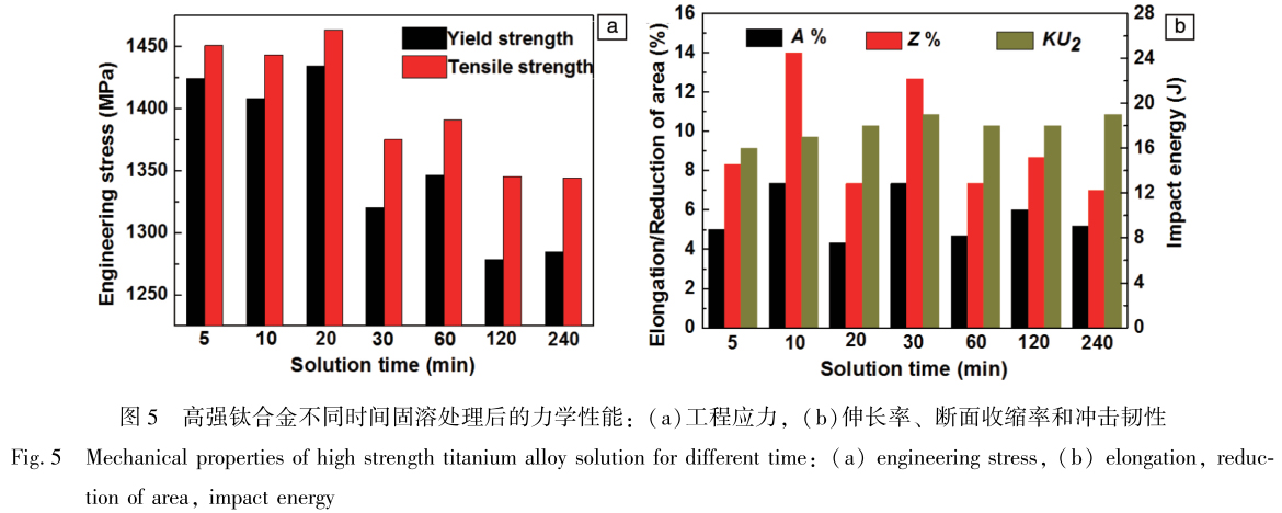 超高強鈦合金力學性能隨固溶時間的變化如圖5所示,固溶時間為5~20min時合金強度較高,塑性與韌性較低,這是由于固溶時間較短,合金未完全發生再結晶,仍有部分原始組織保留。固溶時間在30~240min范圍時,合金發生完全再結晶,隨固溶時間增加,β晶粒直徑從88增加至186μm。而合金的力學性能與固溶時間不符合線性規律,分析認為,固溶時間為60min時,大量因界面遷移形成的小尺寸晶粒引起局部應力集中,此時合金屈服強度及抗拉強度達到最高,分別為1346和1391MPa。固溶時間對合金的延伸率、斷面收縮率以及沖擊韌性沒有顯著影響,這是由于:合金經短時間固溶后晶粒尺寸較小,增加了裂紋沿晶開裂的可能性,同時在一定程度上延長了裂紋的擴展路徑;隨著固溶時間增加,晶粒直徑增加,晶界數量減少,減少了沿晶開裂的可能性,提升了合金的塑性及韌性。因此,綜合以上2方面因素,固溶時間對合金的塑性及韌性無顯著影響。