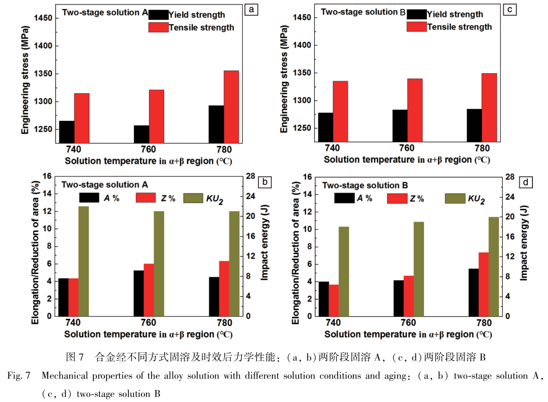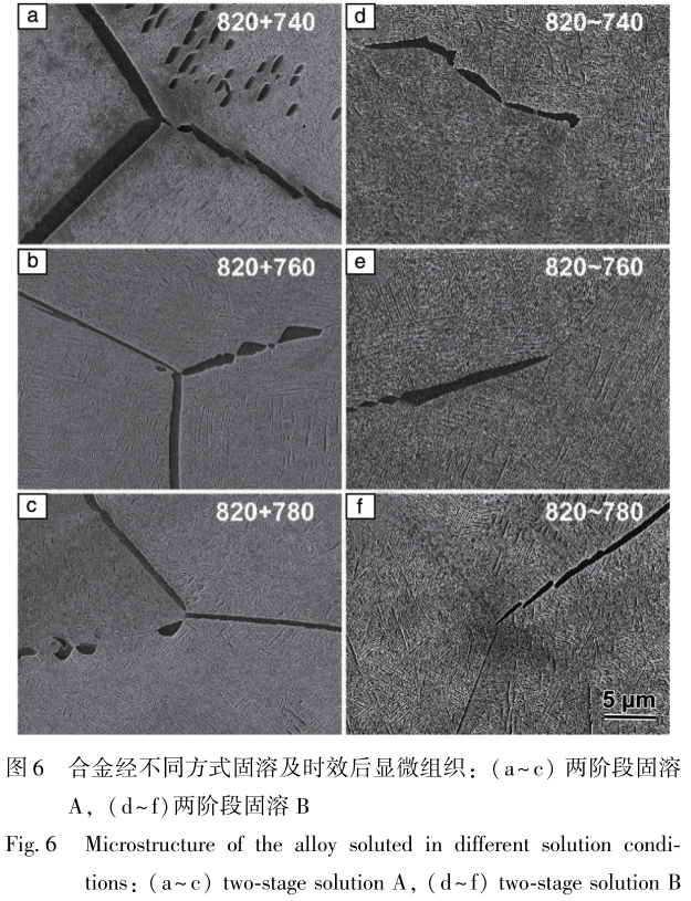 (2)對超高強鈦合金進行兩階段固溶及530℃時效處理,在固溶方式A(β相區固溶水冷至室溫后再進行(α+ β)相區固溶)中,隨著第二階段(α+β)相區固溶溫度降低,晶界粗化效果逐漸明顯,在740℃固溶時因過冷度 較大,部分β晶粒內部形成初生α相;在固溶方式B(β相區固溶后爐冷至(α+β)相區固溶)中,緩慢的冷卻速度僅使部分晶界粗化,隨著固溶溫度降低,晶界α相長大的動力學驅動力降低,因此不同固溶溫度下晶界粗化效果相當,但固溶溫度越低,粗化的晶界數量越多。