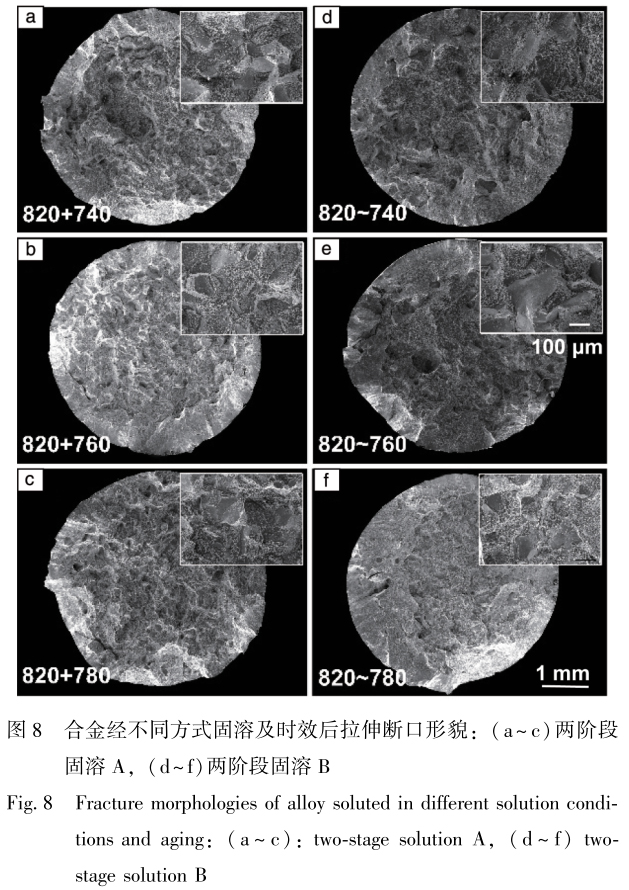 圖8為2種兩階段固溶及統一時效后拉伸斷口形貌,觀察發現,試樣宏觀斷口存在大量平整的小平面,進一步觀察斷口高倍照片,發現這些小平面光滑平整,為典型的沿晶斷裂面,同時也存在部分深度較淺的韌窩,表明斷裂機制為存在沿晶斷裂的混合斷裂機制。通過對比發現,在兩階段固溶方式A中觀察到更多光滑平整的沿晶斷裂面,也驗證了晶界粗化效果顯著的樣品更易發生沿晶斷裂,使得合金強度與塑性同時變差。因此,在實際生產過程中應避免強度較低的α晶界發生粗化,晶界薄弱的問題亟待深入研究。