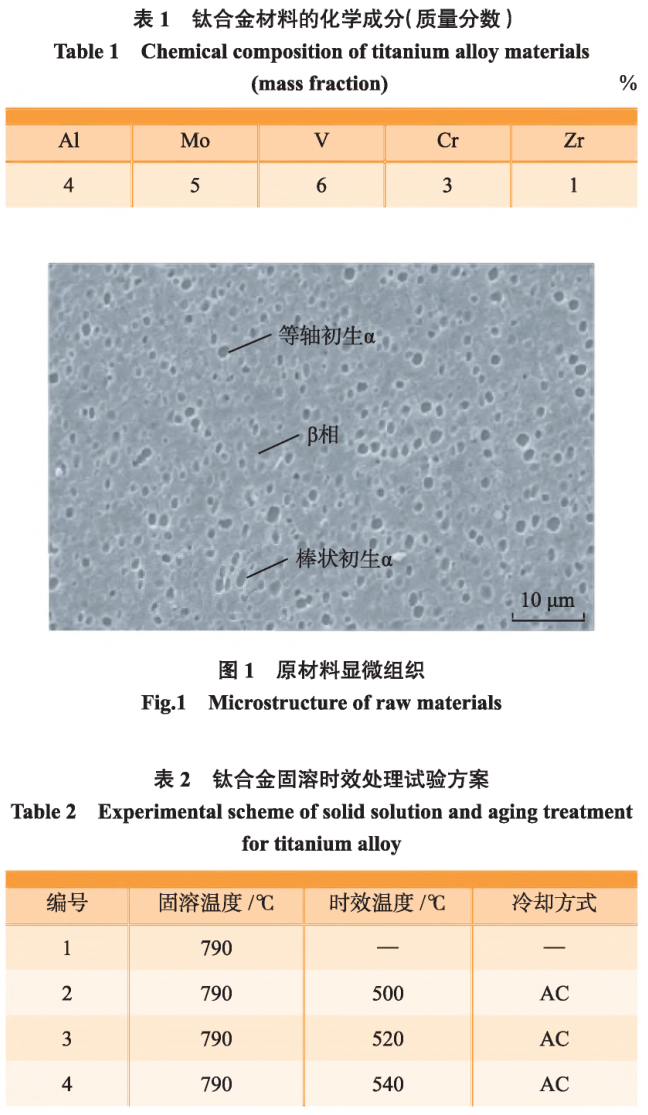 對原材料進行固溶時效處理,試驗方案具體參數如表2所示。制備鈦合金金相試樣,利用Leica DMI5000M光學顯微鏡對其進行顯微組織觀察與分析。在Zeiss Supra-55掃描電子顯微鏡設備上對顯微組織和室溫拉伸斷口的組織形貌進行表征與分析。