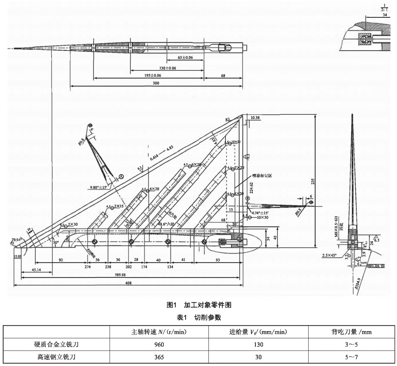 鈦合金結構件翼面裝配弧面及定位槽的銑削加工成型零件圖如圖1所示,加工材料為TC4鈦合金;谠摻Y構件的復雜形狀以及鈦合金材料不佳的切削性能,對夾具系統做出了改進。在本文的工藝優化措施下,切削質量顯著提高,且加工效率有效提升。