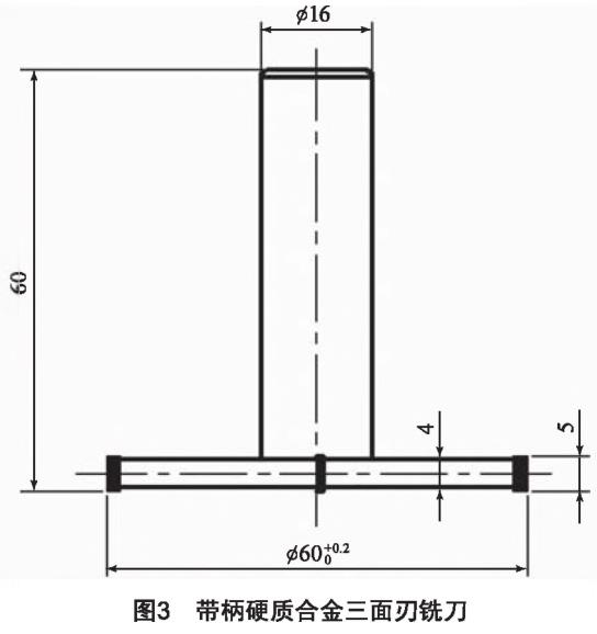翼面定位槽的加工,槽深21.1 mm,槽長280 mm,槽寬(6+0.075) mm,該槽用于翼面與鈦合金結構件艙體的裝配定位,須保證槽底尺寸R30[5]。為了滿足加工要求,自制的帶柄硬質合金三面刃銑刀如圖3所示,刀柄直徑16mm,銑刀直徑(60+0.2)mm,厚度5 mm,刀頭的材料選擇YG類,銑刀前角γ=3°,,后角α=8°,刀尖圓弧半徑為0.5mm,最終滿足了尺寸R30的精度要求。