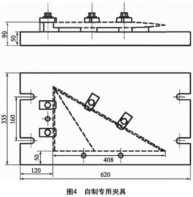 由于翼面結構件的兩側面為兩傾斜復雜型面,選用的常規夾具無法有效裝夾,需要設計一款針對性的專用夾具。針對該現狀,本文自制了專用夾具,如圖4所示。