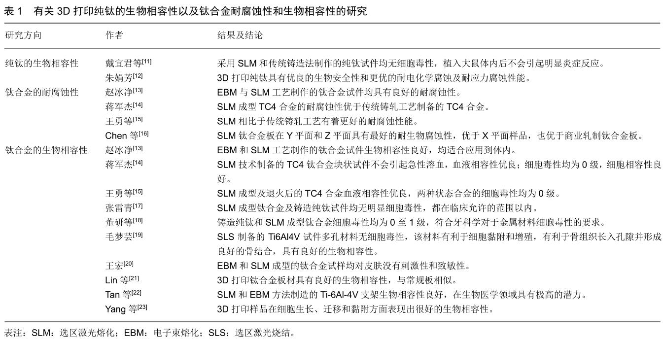 3D打印憑借著加工成形能力強、實現個性化定制、加工周期短、成本降低[27]、可打印材料范圍廣泛[28]、尺寸精度較高等優勢[29],無疑已成為研究熱點。在上述研究中,對于純鈦和鈦合金,不同學者分別采用SLS、SLM、EBM技術和傳統鑄造法制作試件進行耐腐蝕性實驗、細胞毒性實驗、皮下埋植實驗、口腔黏膜刺激實驗、溶血試驗、急性全身毒性試驗、骨內植入試驗等,證實3D打印和鑄造法制作的鈦及鈦合金試件都具有良好的生物安全性,且在某些條件下,3D打印試件的性能更優于傳統鑄 軋[11-23]。3D打印技術不會改變材料的生物安全性,利用該技術的優勢,鈦及鈦合金在牙科及骨科等個性化醫療領域將會有更好的應用前景。