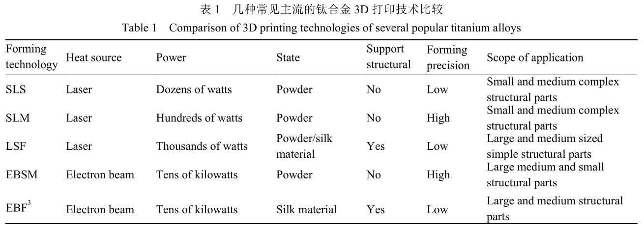 表 1 為幾種常見的鈦合金3D打印技術比較。