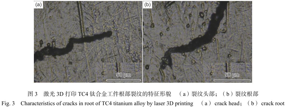 西北工業大學的張鳳英等[36]持相同的看法,也認為是工藝參數選擇不當,造成 SLM 制件內部粉末熔合不良,導致制件發生開裂。劉延輝等[37]研究了激光3D打印 TC4 鈦合金根部裂紋產生的原因,微觀組織如圖 3 所示,認為 TC4 鈦合金出現裂紋的根本原因是根部存在組織缺陷、過大的殘余應力、性能分布不均以及預熱溫度不足等共同導致的。劉彥濤等[38]研究功能梯度材料 TA15 + Ti2 AlNb 合金激光熔融沉積成形時發現,激光熔化沉積技術所制備異種材料的界面為冶金結合,異種材料結合界面會形成過渡區,過渡區通常是梯度復合結構的薄弱環節,容易產生裂紋,此裂紋具有沿界面斷裂的特征,他們認為裂紋形成的原因是異種材料界面過渡區通常會有對性能不利的第二相析出,導致材料易沿界面斷裂。