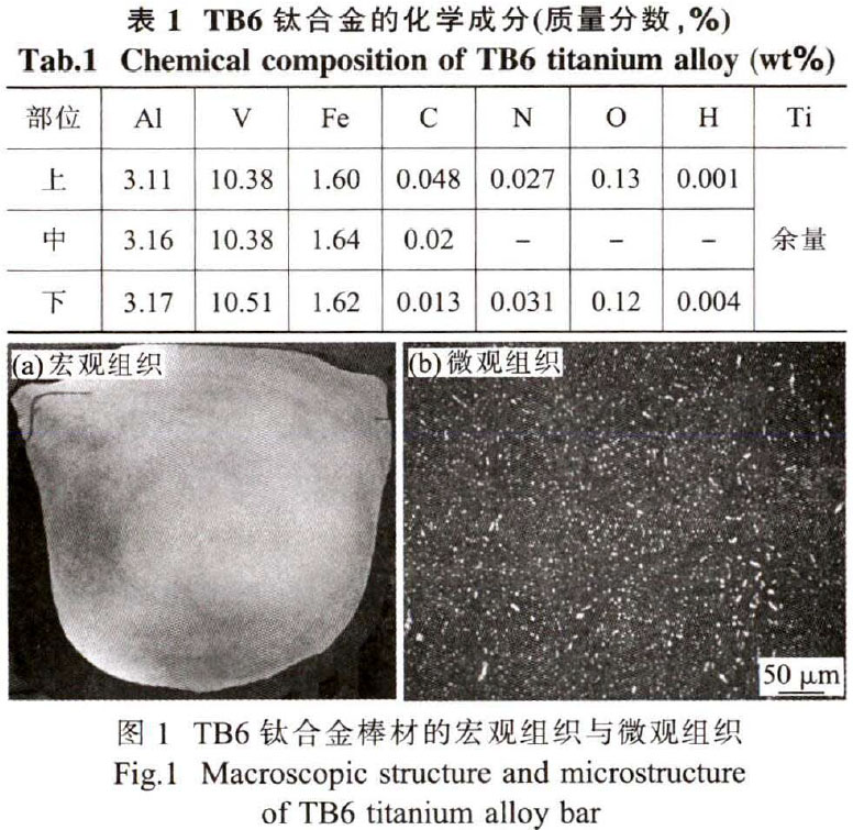 對表1中的數據分析可知,TB6鈦合金的化學成分符合GJB1538A一2008的要求。鑄錠經多火次鍛造成Φ90mm規格棒材。采用金相法測定該批合金的相變點,(α+β/β)相變點為810~815℃。TB6棒材的宏觀組織與微觀組織如圖1所示。由圖可見,宏觀組織均勻、無清晰晶;微觀組織由彌散分布的等軸初生α相與β轉變組織組成。