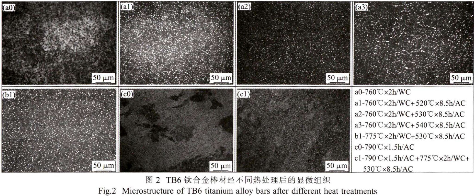 方案a1、a2、a3、b1均采用的是常規固溶/時效制度,合金在相變點以下30~60℃固溶處理,可以使β相中鐵和釩富化(因此β相變更加穩定)并使初生α相的體積分數達到與該固溶溫度相當的平衡值β;w的再結晶及隨后晶粒長大過程是緩慢的,但初生α相的調整則很迅速。在固溶過程中,在保留絕大部分β相的同時,有可能出現少量的誘發馬氏體α"相和淬火相。α"具有正交點陣結構,固溶處理溫度越高,出現的可能性越大。TB6鈦合金由于β相中的Fe和V富化到足以使M、降低到室溫以下,將不會發生馬氏體轉變。采用X射線衍射結構分析得出,在750790℃固溶溫度淬火后的相組成為β+α+少量α"+微量[4。520℃時效過程中發生β→β+α轉變,只要有一個次生α(α)片在位錯、晶粒邊界或其他晶粒缺陷處形成,在這個α片附近的β基體中,α相的形核幾率就大大增加。首先形成一束一束的α,相片,隨著保溫時間的延長或時效溫度的升高,這些α。相片束長成一體,呈現一