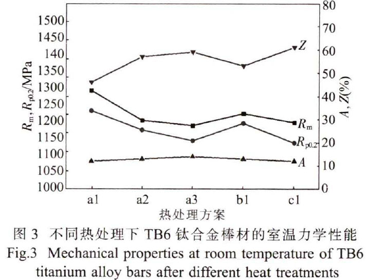 TB6合金經不同熱處理后的室溫力學性能見圖3。對比方案a1、a2與a3可知,隨著時效溫度的升高,合金的抗拉強度降低,從1265MPa降至1171MPa,但合金的塑性升高,伸長率從12%升至14%,斷面收縮率從46%升至59%。主要原因是,隨著時效溫度的升高,從β基體中析出的α相粗化,未沉淀區面積增大,晶界、晶內網狀物析出現象減輕或消除,所以合金的塑性增加[910。但同時時效析出的α相(α)粗大且分布不均勻,強化效果降低,因此合金的強度降低。