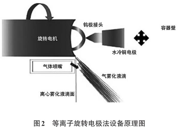 等離子旋轉電極法(PREP)是離心霧化法制取鈦合金粉末的主要方法之一[13-14]。先將鈦合金原材料制備成圓棒狀,利用等離子弧作為熱源持續熔化高速旋轉的鈦及鈦合金棒料端面,在10000~20000r/min的高速離心力作用下,將熔融的鈦合金液滴甩成滴霧狀,并在惰性氣體(Ar或He)的冷卻作用下快速凝固成球狀鈦合金粉末,如圖2所示。采用該工藝制備的鈦合金粉末的顆粒非常接近球形,粉末流動性好,間隙元素含量與原材料接近。但受到轉速的影響,等離子旋轉電極法只能制備粒度較大的鈦合金粉末,且生產效率低,生產成本高。