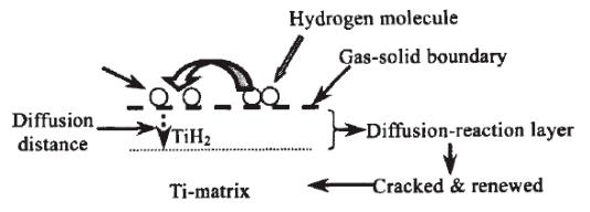氫化脫氫工藝利用了鈦(鈦合金)與氫在一定溫度下的可逆反應,其主要流程是鈦料-表面凈化處理-氫化-粉碎-篩分-脫氫-粉碎-篩分-混合-組批-真空封裝-商品鈦粉。先將鈦在一定溫度下氫化生成脆性氫化鈦后破碎成微細粉末,然后將氫在高溫真空條件下脫除,從而得到鈦(鈦合金)粉末。在氫化過程中,反應是從外向內單向進行的“吸附-擴散-反應-再吸附-再擴散-再反應”過程,且由于氫化過程中擴散層的存在(如圖4所示),當原料尺寸較大時,原料內部不能被氫化透,因此在大量吸氫反應后,還需要相當長的擴散時間才能使原料內部得以充分氫化。在脫氫過程中,反應是從物料表面向內部逐漸進行的“反應-擴散-脫附-再反應-再擴散-再脫附”過程,且高溫下粉末容易燒結成塊,因此,在大量脫氫后,還需要相當長的時間才能將氫脫除,而高溫脫氫時間的延長會進一步促進粉末的燒結成塊,為此必須增加一道破碎工序才能得到鈦(鈦合金)粉末。從氫化脫氫過程分析中可知,由于反應中后期尤其是脫氫工序中后期反應時間大大延長,使得能耗增加,生產周期變長,從而導致了粉末氧含量增加[20]。