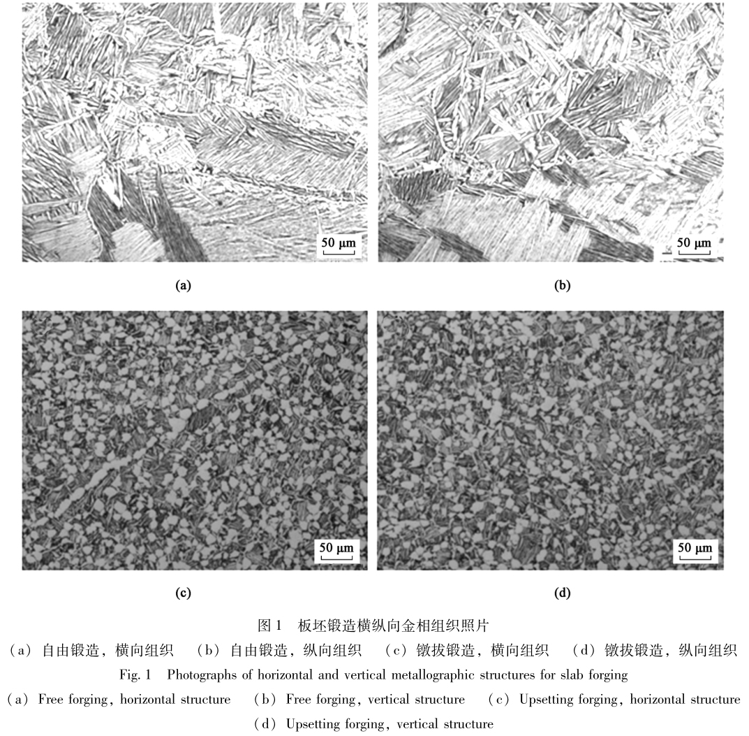 性能對比結果也充分反映了金相組織演變差異的過程,自由鍛造板坯組織由于是在相變點以上完成成形,所以組織形貌還處于初期,但是鐓拔鍛造的板坯則在兩相區以上開始、直至相變點之下完成鍛造過程,組織破碎到一定程度,相態較為穩固。
