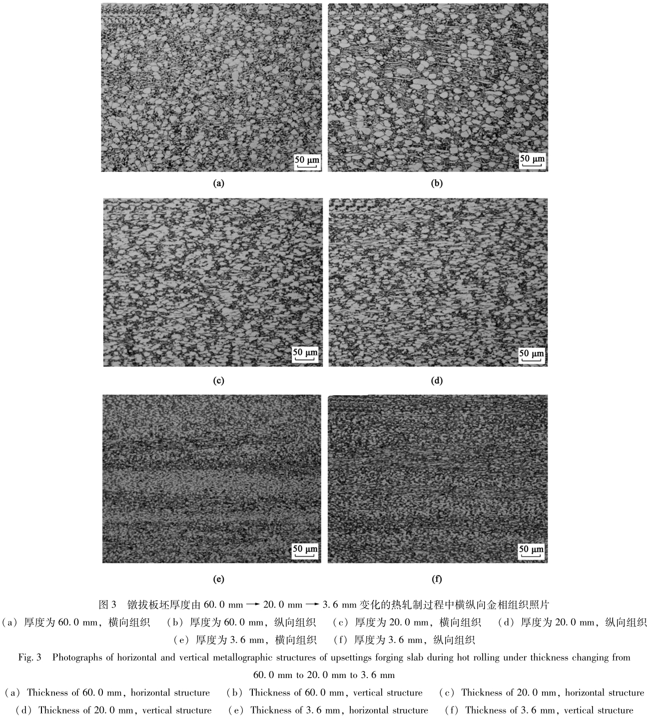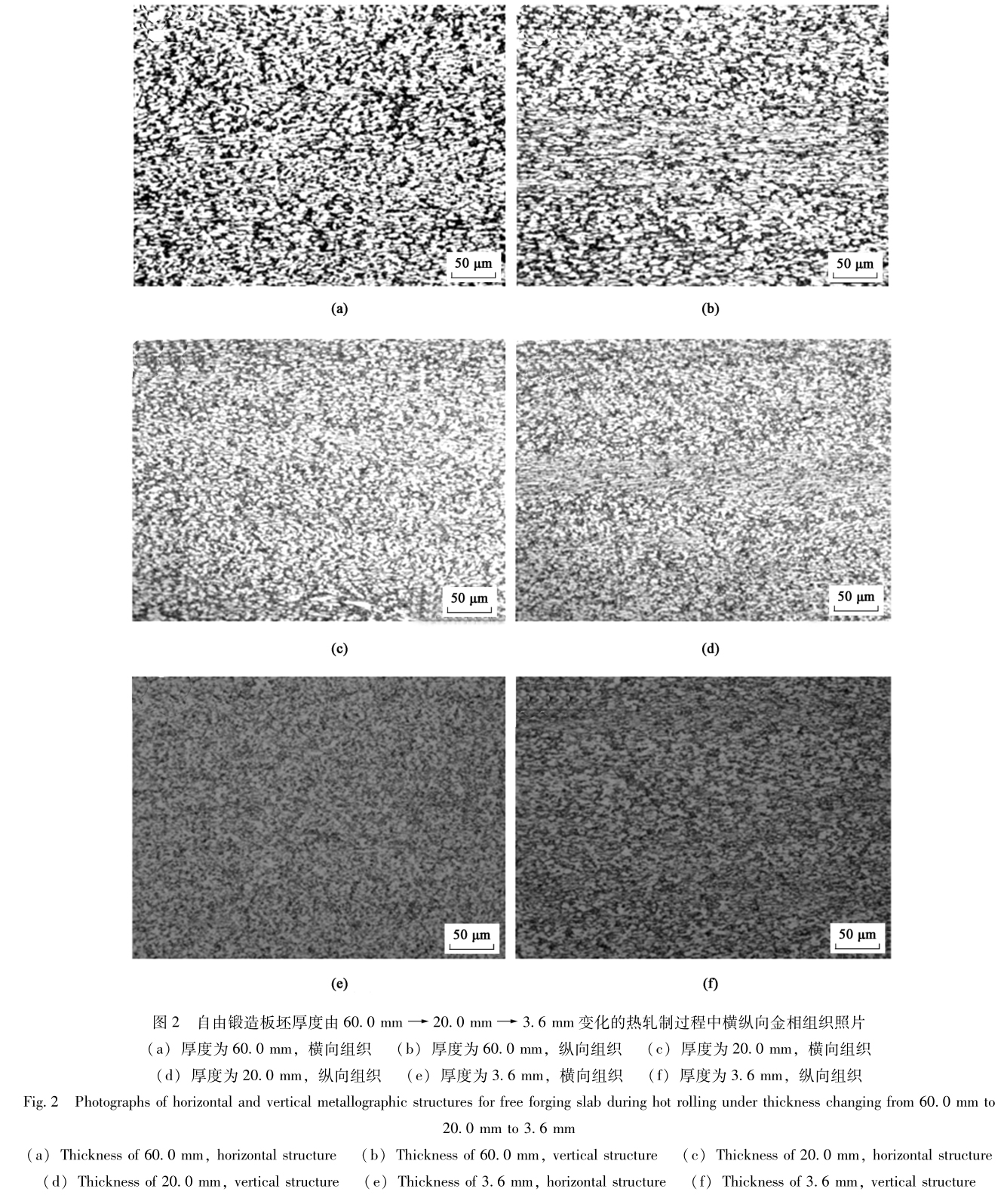 圖2為兩種方式鍛造生產的板坯經過軋制后得到的金相組織。厚度尺寸的變化為60.0mm-->20.0mm-->3.6mm,自由鍛造組織整體的破碎等軸情況,隨著軋制的進行,越接近成品,組織形貌越好,橫縱向組織已完全破碎等軸,橫向組織優于縱向組織,這是因為軋制存在軋制方向的緣故,造成兩個方向的組織有所不同。