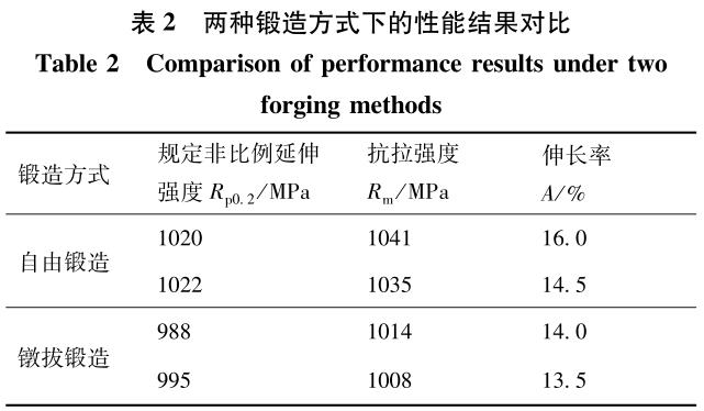 表2表明,采用自由鍛造方式生產的成品板材性能上要優于鐓拔鍛造的板材。