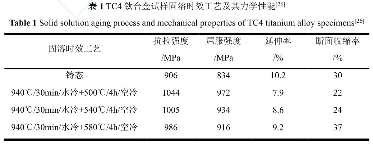 另一方面,固溶時效處理通過精確控制固溶溫度(通常低于相變點30~80℃),有效調節了初生α相、次生α相及β轉變組織的尺寸與體積分數,進而在保持或提升材料韌性的同時,優化了其強度與塑性。固溶處理后的時效階段,針狀馬氏體α’與過冷β相發生分解,轉化為彌散穩定的α相,與β相共同構成了(α+β)兩相組織,這一轉變顯著增強了合金的硬度和強度,為材料性能的提升開辟了新途徑[27-29]。徐堅等[26]深入探究了固溶時效工藝參數變化對TC4鈦合金在室溫下力學性能的具體影響。他們的研究發現,通過固溶時效處理,鈦合金中的針狀馬氏體α’相與亞穩態β相經歷了分解過程,轉變為彌散分布的穩定α+β相結構,這一轉變顯著增強了TC4鈦合金的強度特性。進一步分析指出,在保持固溶溫度恒定的條件下,隨著時效溫度的逐漸升高,TC4鈦合金的強度呈現出下降趨勢,而塑性則相應提升。這一發現揭示了時效溫度調控在平衡鈦合金強度與塑性方面的重要作用。尤為值得關注的是,當固溶溫度設定為940℃、時效溫度選擇為500℃時,TC4鈦合金展現出了優異的綜合力學性能:不僅保持了較高的強度水平,還兼具了良好的塑性表現。