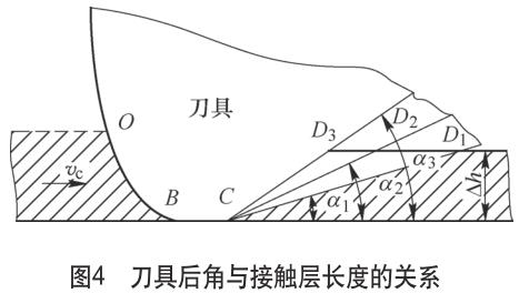 (3)后角角度后角是配合前角調(diào)整切削刃的鋒利程度和強(qiáng)度的角,它的主要作用是減小切削過程中加工表面與刀具后刀面之間的摩擦力,因而它對刀具壽命和加工表面質(zhì)量有很大的影響,刀具后角與接觸層長度的關(guān)系如圖4所示。