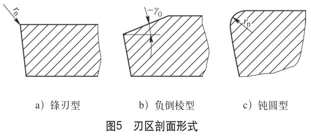 (4)前刀面形狀選擇刃區(qū)剖面形式如圖5所示。鋒刃型半徑很小,切削刃很鋒利(見圖5a),但是鋒刃的抗沖擊性能差,即使切削過程遇見小突起,都極有可能導(dǎo)致崩刃。鈍圓型切削刃(見圖5c),不但在提高切削刃強(qiáng)度方面獲得與負(fù)倒棱型(見圖5b)同樣的效果,而且比負(fù)倒棱型更有利于消除刃區(qū)微小裂紋。同時,在切削過程中對已加工表面還有一定的熨壓和消振作用,不但有利于提高已加工表面質(zhì)量,還提高了刀具的壽命。因此,鈦錠切削應(yīng)選用倒棱型和鈍圓型這兩種前刀面形狀。