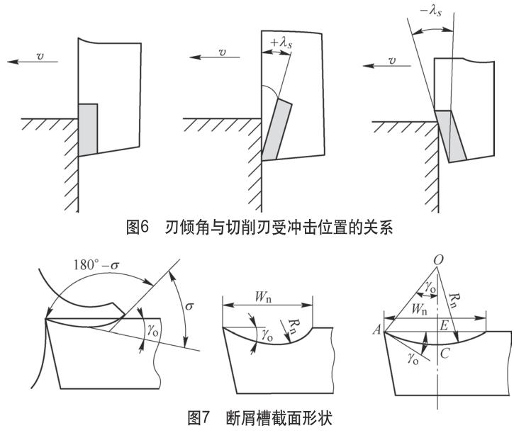 (5)刃傾角刃傾角是主切削刃與基面之間的夾角,其作用是控制切屑排出的方向。當(dāng)?shù)都鉃橹髑邢魅猩献罡唿c(diǎn)時,則λS>0°;當(dāng)?shù)都鉃橹髑邢魅猩献畹忘c(diǎn)時,則λS<0°;當(dāng)主切削刃與基面平行時,則λS=0°。多數(shù)情況下車刀具都是取λS=0°,刃傾角與切削刃受沖擊位置的關(guān)系如圖6所示。