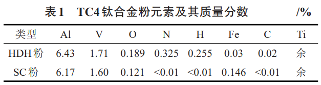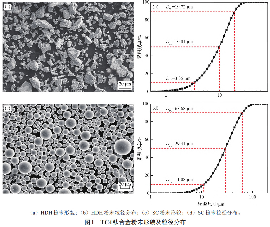 粉末原料采用氫化脫氫(HDH)TC4粉末和球形(SC)TC4粉末,粉末元素及含量見(jiàn)表1,兩種粉末形貌及粒徑分布見(jiàn)圖1。凝膠體系中有機(jī)單體為甲基丙烯酸羥乙酯(HEMA,分析純,純度大于等于98.5%),交聯(lián)劑為N,N-二甲基丙烯酰胺(MBAM分析純,純度大于等于98.5%),溶劑為二甲苯(C8H10分析純,純度大于等于99.5%),引發(fā)劑為過(guò)氧化苯甲酰((C6H5CO)2O2,簡(jiǎn)稱BPO,分析純,純度大于等于98.0%)。油酸和異辛醇分別作為分散劑和消泡劑。