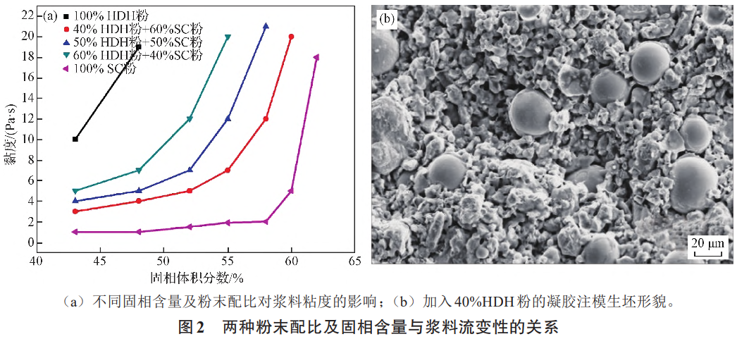 對(duì)凝膠注模料漿來(lái)說(shuō),球形粉末流動(dòng)性好,不易氧化,而氫化脫氫粉保形性好,但流動(dòng)性差,比表面積大,燒結(jié)時(shí)易與雜質(zhì)元素反應(yīng)導(dǎo)致性能變差,但從成本上考慮,在料漿中添加40%(質(zhì)量分?jǐn)?shù))以上的氫化脫氫粉,總原料成本可降低30%以上,有利于實(shí)現(xiàn)低成本的目標(biāo)。另一方面,在粘結(jié)劑一定的情況下,固相含量越高,燒結(jié)收縮系數(shù)越小,產(chǎn)品尺寸越穩(wěn)定,但過(guò)高的固相含量會(huì)使?jié){料流動(dòng)性變差而影響成形。因此,在保證粘結(jié)劑和油酸濃度不變的情況下,對(duì)不同粉末配比及固相含量的漿料粘度進(jìn)行測(cè)試,結(jié)果如圖2所示。當(dāng)固相含量相同時(shí),球形粉末占比越高,料漿的流動(dòng)性越好。綜合考慮成本和料漿性能,當(dāng)料漿中加入50%(質(zhì)量分?jǐn)?shù))HDH粉時(shí),固相含量為55%(體積分?jǐn)?shù))時(shí),既能保證漿料一定的流動(dòng)性,同時(shí)還有較低的收縮系數(shù)。