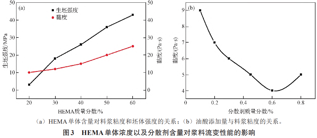 粘結(jié)劑的濃度對(duì)漿料流動(dòng)性和生坯強(qiáng)度有重要的影響。粘結(jié)劑濃度過(guò)低,生坯強(qiáng)度不足,產(chǎn)品難以保持形狀,粘結(jié)劑濃度過(guò)高,漿料流動(dòng)性差,脫脂時(shí)間長(zhǎng),殘留雜質(zhì)多,因此,需要在保證漿料流動(dòng)性和生坯強(qiáng)度的情況下盡量降低粘結(jié)劑的濃度。圖(3a)為加入50%HDHTC4粉,固相含量55%時(shí)漿料濃度隨HEMA單體濃度的變化曲線。由圖可知,漿料粘度的升高速率隨單體濃度的增加而逐漸降低,這是由于HEMA單體具有一定的懸浮分散作用,濃度增加時(shí)可在一定程度上提高漿料的流動(dòng)性。當(dāng)單體濃度為30%(質(zhì)量分?jǐn)?shù))時(shí),漿料流動(dòng)性較好,同時(shí)保證生坯具有足夠的強(qiáng)度。