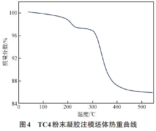 在生坯脫脂過(guò)程中,鈦合金粉末容易被氧化,須在真空或者惰性氣氛中進(jìn)行。為制定適合的熱脫脂升溫制度,了解粘結(jié)劑在各個(gè)溫度下的分解情況,減少粘結(jié)劑以游離碳的形式殘留在脫脂坯,對(duì)坯體進(jìn)行了熱重分析。圖4為凝膠坯體熱重曲線,第一階段為結(jié)合水的去除、調(diào)節(jié)劑和大分子鏈的裂解。此階段發(fā)生在230~350℃之間,鈦粉有約2.2%的失重。第二階段在350~450℃,此階段失重速度最快。350~400℃失重曲線最陡,對(duì)應(yīng)聚合物網(wǎng)絡(luò)的大規(guī)模分解,400~450℃失重速率逐漸下降,在350~450℃時(shí)失重約10.3%。第三階段為450℃之后,仍有較少量的失重,這是因?yàn)樵跓嶂販y(cè)試過(guò)程中升溫速率較快,分解殘留物不能排除。根據(jù)上述熱分析結(jié)果,凝膠注模鈦在脫脂燒結(jié)過(guò)程中,應(yīng)在較小的升溫速率下,在300~450℃之間緩慢加熱,避免有機(jī)物分解過(guò)快導(dǎo)致坯體開(kāi)裂。