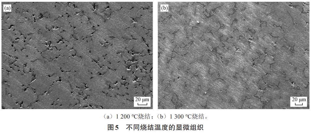 圖5為不同燒結(jié)溫度下燒結(jié)態(tài)樣品的微觀組織。當(dāng)燒結(jié)溫度為1200℃時(shí),在組織中存在較多孔隙,并且孔隙呈不規(guī)則形狀且連續(xù),燒結(jié)密度僅有94.3%。當(dāng)燒結(jié)溫度提高至1300℃時(shí),組織中的孔隙數(shù)量明顯減少,且形狀均為細(xì)小的圓形封閉孔洞,燒結(jié)密度達(dá)到99.5%。