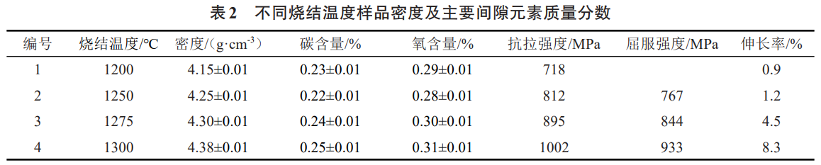 坯體在1200~1300℃下真空燒結(jié)后的力學(xué)性能和密度在表2中列出。結(jié)果顯示,在1200~1300℃溫度范圍內(nèi),樣品的致密度隨溫度的升高而升高,1300℃時(shí)基本達(dá)到全致密。在1200℃燒結(jié)時(shí),燒結(jié)密度僅有4.15g/cm3,相對(duì)密度94.3%,導(dǎo)致屈服強(qiáng)度僅為718MPa,基本無(wú)伸長(zhǎng)率。燒結(jié)溫度繼續(xù)升高至1275℃時(shí),密度升高至4.30g/cm3,強(qiáng)度和塑性明顯提高。1300℃燒結(jié)的樣品燒結(jié)密度達(dá)到4.38g/cm3,相對(duì)密度達(dá)到99.5%以上,基本達(dá)到全致密,抗拉強(qiáng)度為1002MPa,屈服強(qiáng)度為933MPa,伸長(zhǎng)率為8.3%。