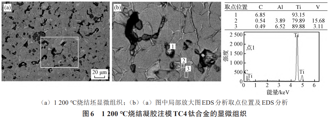 氧元素是影響鈦合金粉末燒結(jié)致密的重要因素。而凝膠注模燒結(jié)坯中的氧含量一部分來(lái)源于鈦合金粉末原料,另一部分則來(lái)源于HEMA熱分解過(guò)程中鈦粉與小分子碳氧氫有機(jī)物的化學(xué)反應(yīng)。常溫下,鈦粉末表面有一層致密的氧化膜,但在高溫下,氧在鈦中的固溶度很高。當(dāng)升溫至550~700℃時(shí),鈦粉末表面氧化膜及脫脂過(guò)程中所吸附碳氧小分子逐漸溶解并向基體擴(kuò)散,鈦的致密化過(guò)程開(kāi)始。由于添加了一部分HDH粉,其形狀不規(guī)則,粒度細(xì)小,比表面積大,活性更高,在相同溫度下比球形粉更容易吸附脫脂分解的小分子碳氧化合物,導(dǎo)致增氧增碳。另一方面,與注射成形所使用的粘結(jié)劑不同,HEMA需要更高的分解溫度和更長(zhǎng)的分解時(shí)間,也促進(jìn)了鈦粉末在脫脂過(guò)程中與雜質(zhì)元素的反應(yīng),導(dǎo)致氧含量的升高,阻礙了燒結(jié)致密化。另外,通過(guò)觀察樣品的顯微組織發(fā)現(xiàn),在不同燒結(jié)溫度樣品的孔洞和晶界處均發(fā)現(xiàn)多處深灰色顆粒物,如圖6(a)中的紅色標(biāo)記所示。將樣品局部放大后對(duì)不同位置進(jìn)行成分分析,如圖6(b)所示,取1,2,3三點(diǎn),點(diǎn)1取樣點(diǎn)為黑色孔洞內(nèi)的深灰色顆粒,點(diǎn)2取樣點(diǎn)為晶間淺色組織,點(diǎn)3取樣點(diǎn)為晶內(nèi)灰色組織,EDS成分如圖6(b)表格和能譜圖所示。點(diǎn)2和點(diǎn)3成分分別與β和α態(tài)組織相符,可確定晶間淺色組織為β相,晶內(nèi)為α相。點(diǎn)1碳含量約6.94%,余量為鈦,說(shuō)明深灰色顆粒是碳化鈦。經(jīng)分析,凝膠網(wǎng)絡(luò)中的高分子聚合物在熱分解過(guò)程中發(fā)生如低分子量產(chǎn)物的熱分解、大分子的鍵裂解、重組反應(yīng)和揮發(fā)等一系列反應(yīng),在有機(jī)物分解和排出坯體過(guò)程中,分解的小分子碳氧氫有機(jī)物在粉末顆粒間的空腔內(nèi)形成碳氧濃度較高的氣氛。當(dāng)溫度升高時(shí),氧碳和鈦粉發(fā)生原位反應(yīng):氧元素固溶在鈦基體中,而由于碳元素在鈦中固溶度較低,則在晶界處和晶粒內(nèi)部形成了TiC顆粒。