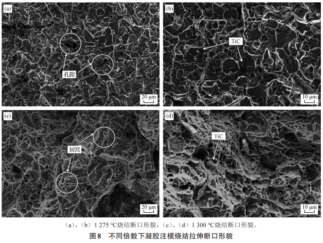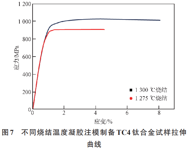 1275℃燒結(jié)時(shí)相對(duì)密度97.5%,內(nèi)部仍殘留約2.5%的孔隙使材料強(qiáng)度、韌性下降,是伸長(zhǎng)率偏低的主要原因。當(dāng)提高燒結(jié)溫度至1300℃,抗拉強(qiáng)度和伸長(zhǎng)率都大幅度上升。通常來(lái)說(shuō),TC4鈦合金的抗拉強(qiáng)度一般在895~965MPa之間,經(jīng)過(guò)固溶處理和時(shí)效處理,抗拉強(qiáng)度可以提高到1100MPa或更高。在1300℃燒結(jié)后,抗拉強(qiáng)度為1002MPa。這由于較高溫度下燒結(jié)的相對(duì)密度較高,強(qiáng)度和塑性都隨致密度的升高而升高。然而,相比未經(jīng)強(qiáng)化處理的樣品,抗拉強(qiáng)度仍明顯偏高,除了致密度上升帶來(lái)綜合性能的提高,還歸因于氧、碳元素的固溶強(qiáng)化,以及TiC顆粒的第二相強(qiáng)化。