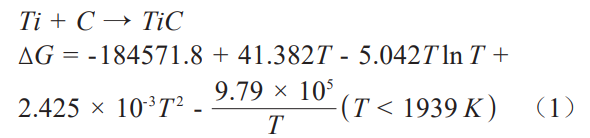 在1473~1573K下,Ti與C反應(yīng)的吉布斯自由能∆G<0,表明在1200~1300℃下燒結(jié)時(shí),TiC的原位生成是自發(fā)的。工業(yè)生產(chǎn)中,由于TiC硬度高,熔點(diǎn)高,化學(xué)穩(wěn)定性好,與鈦基體具有良好的冶金相容性,常常作為鈦基合金或純鈦基質(zhì)的增強(qiáng)相。