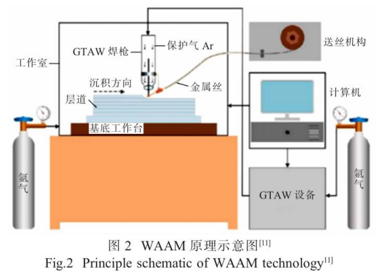 與傳統的大規模生產方式相比,增材制造可以滿足小批量定制化需求,直接從3DCAD模型生產,沒有轉換成本;以數字文件的形式進行設計,方便共享,方便組件和產品的修改和定制。目前,應用較為廣泛的增材制造技術包括光固化成型工藝(stereo lithography apparatus,SLA)、選擇性激光燒結(selectivelaser sintering,SLS)、三維打印技術(three dimensional printing,3DP)、熔融沉積制造工藝(fused deposition modeling,FDM)、電弧增材制造(wire and arc additive manufacturing,WAAM)和氣溶膠打印技術(aerosoljet,AJ)等,WAAM是金屬材料領域應用較為廣泛的一種工藝,其原理叫如圖2所示。